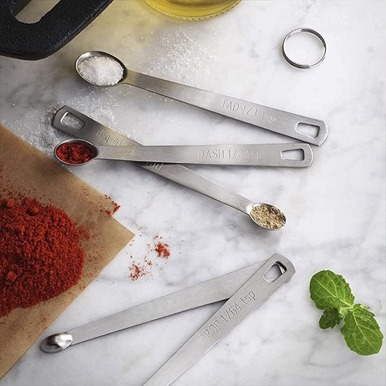 Avez-vous déjà ressenti cette frustration quand une pincée de trop ruine votre plat? Ces doseurs changent la donne. Chaque cuillère de l'ensemble est soigneusement calibrée pour offrir exactement la mesure indiquée: 1/4, 1/8, 1/16, 1/32 et 1/64 de cuillère à café. Les mesures sont gravées directement dans le métal, garantissant leur lisibilité permanente, contrairement aux inscriptions qui s'effacent sur les ustensiles en plastique. Vos dosages seront désormais d'une précision professionnelle.